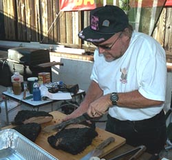 Dan, Captain of Coyote Road Kill focuses his spiritual being on the knife edge as he deftly slices the brisket | |
